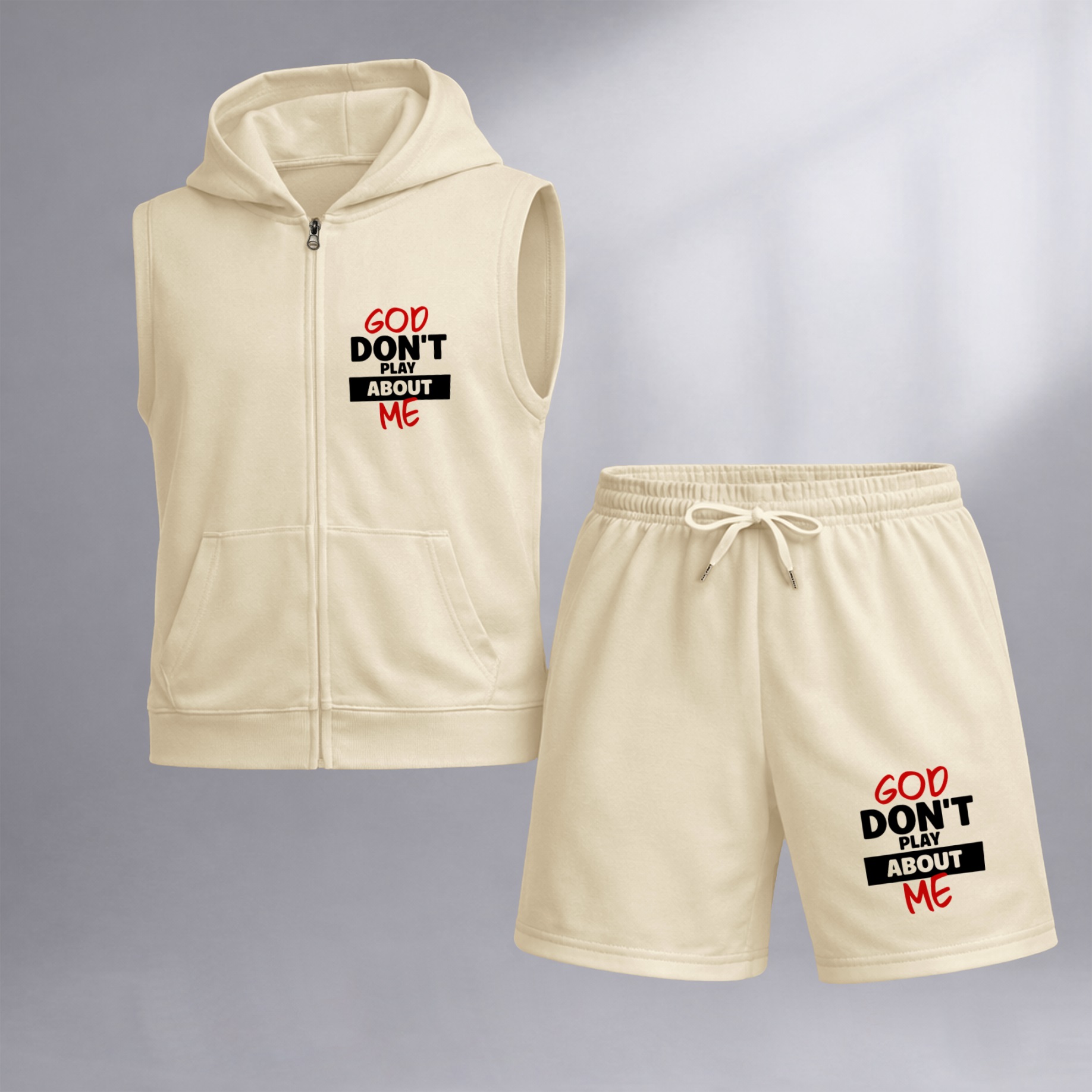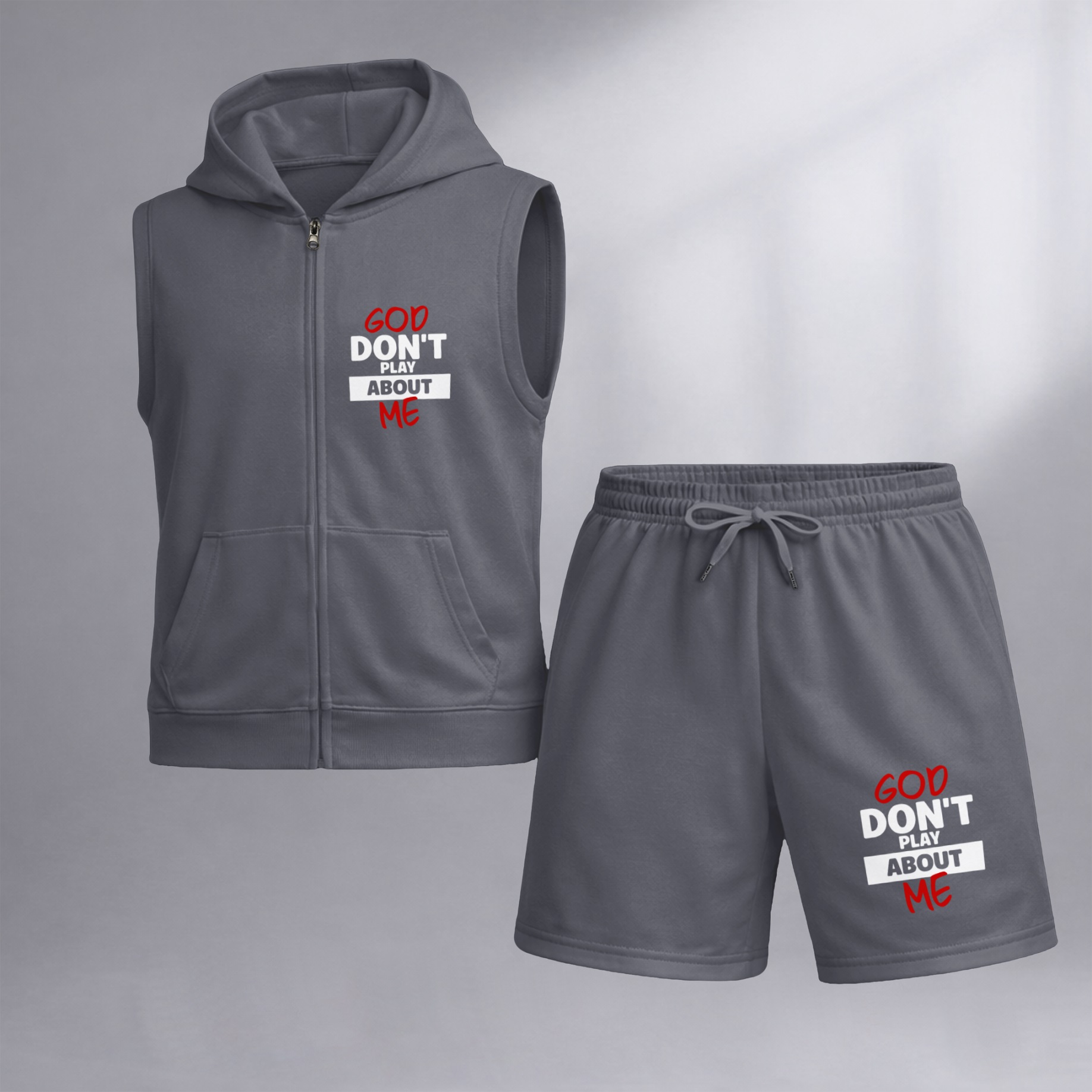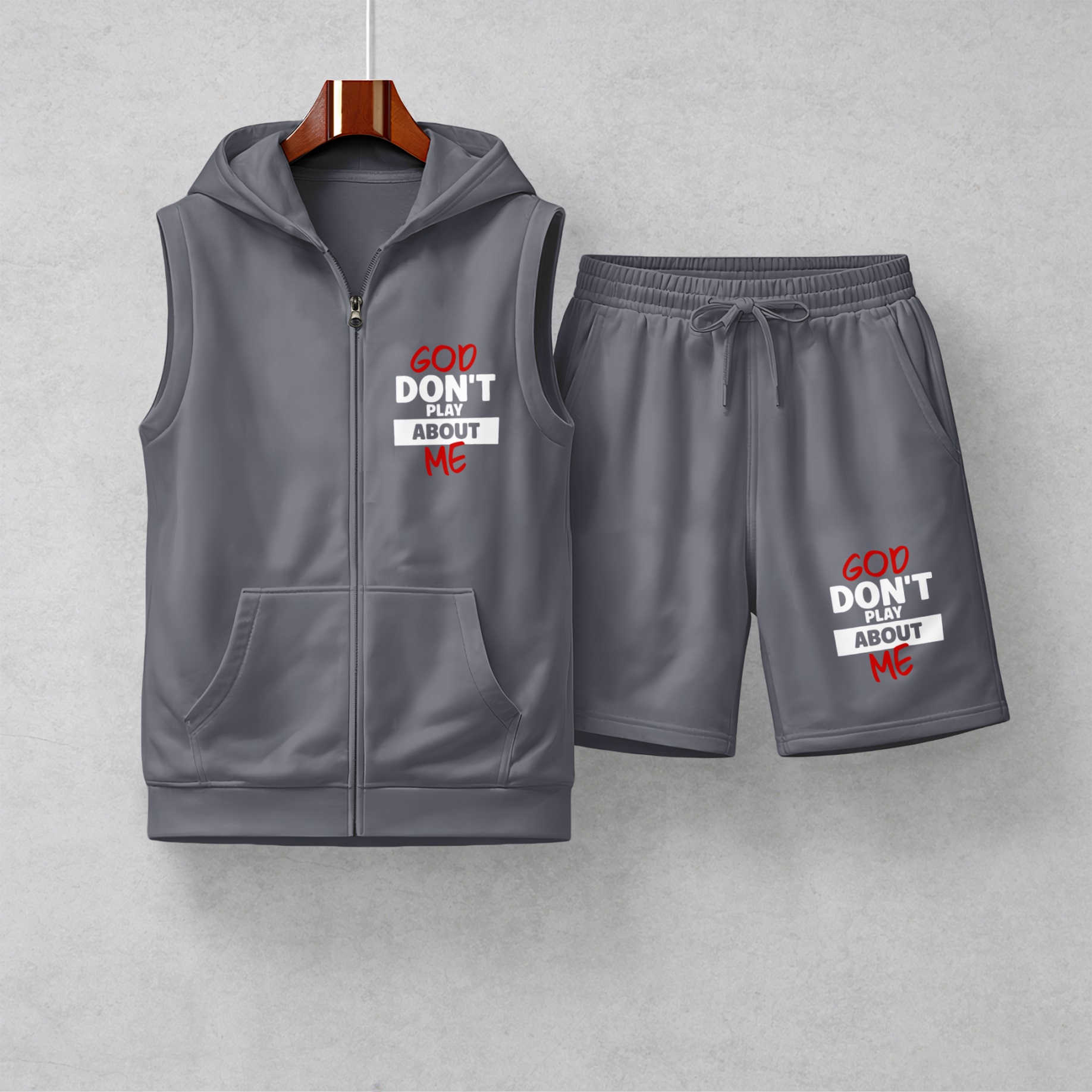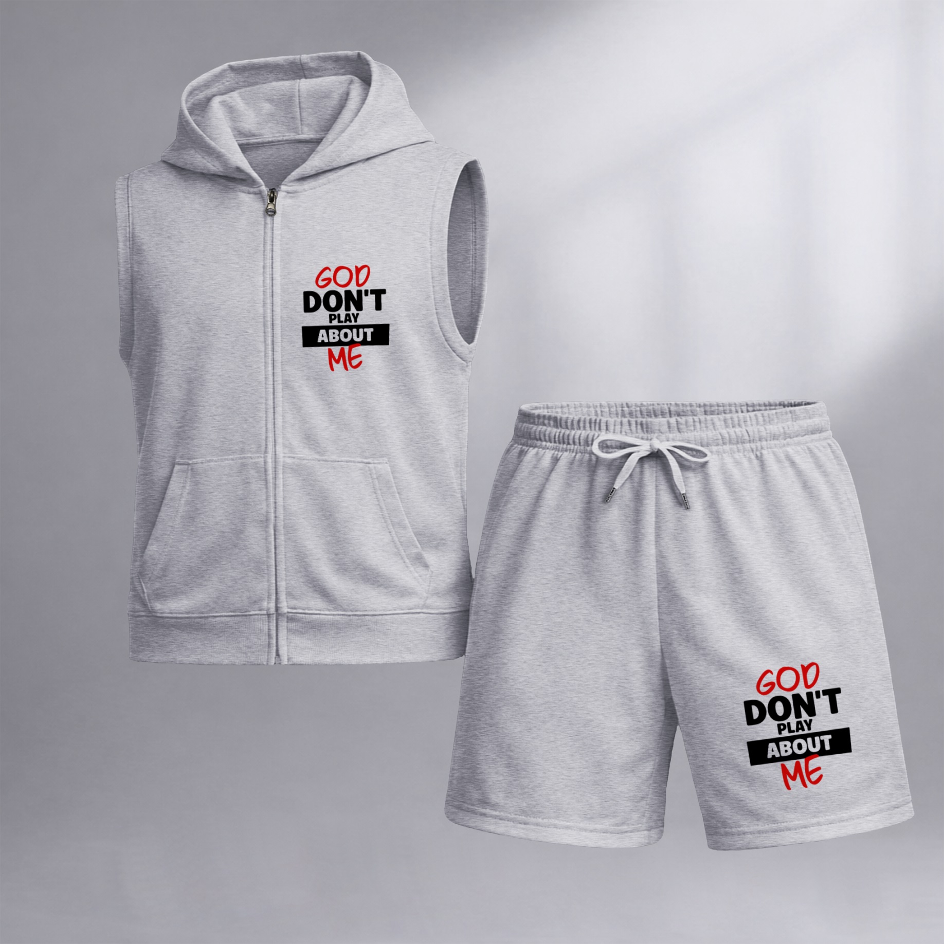 Men's God Don't Play About Me Graphic Sleeveless Hoodie Shorts Set 2 Piece Outfit Faith Letter Print Zip Up Hooded Vest Drawstring Shorts Summer Casual Gym Workout Streetwear Breathable Lightweight Athletic Lounge Set