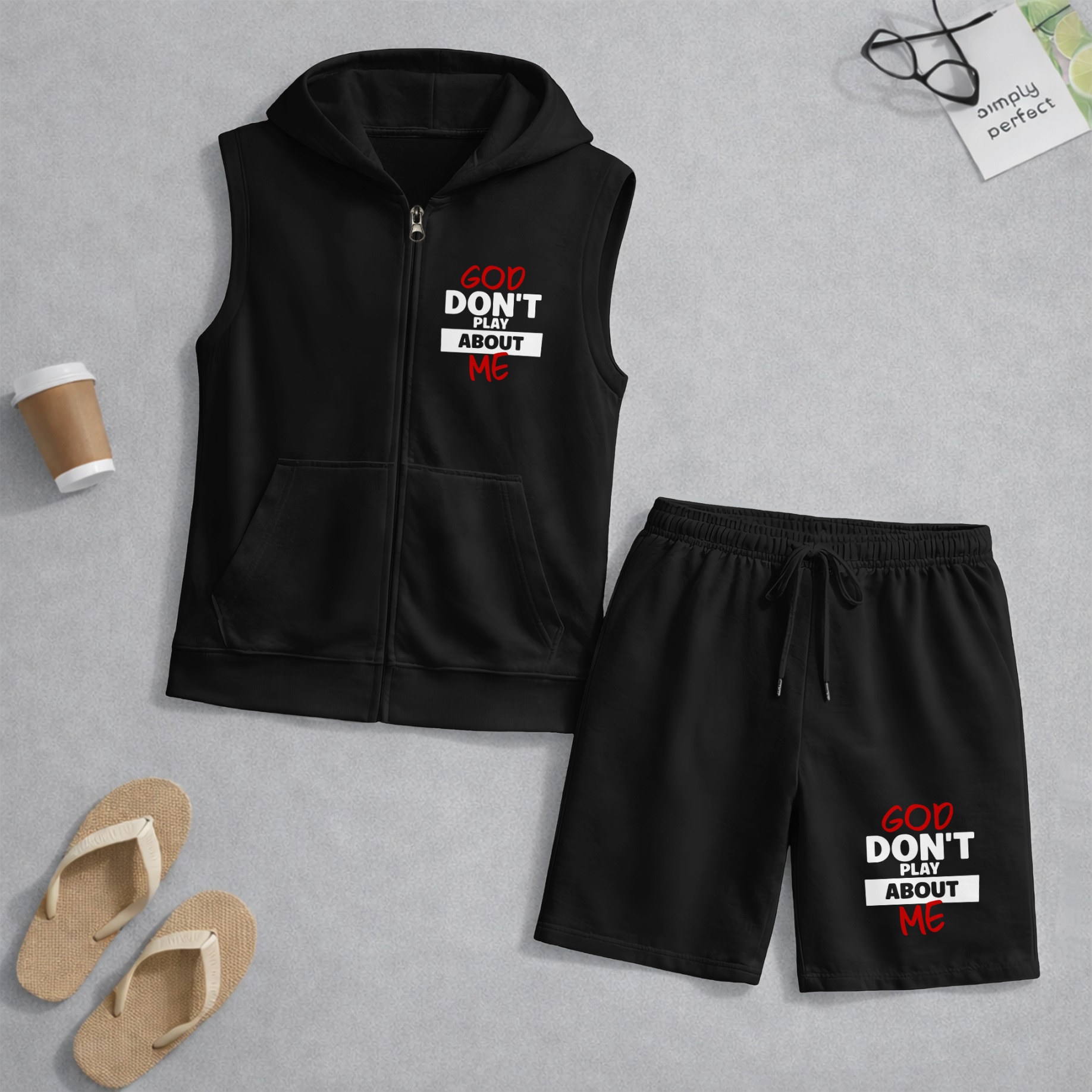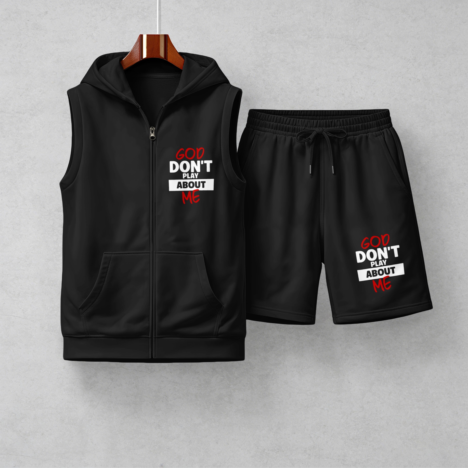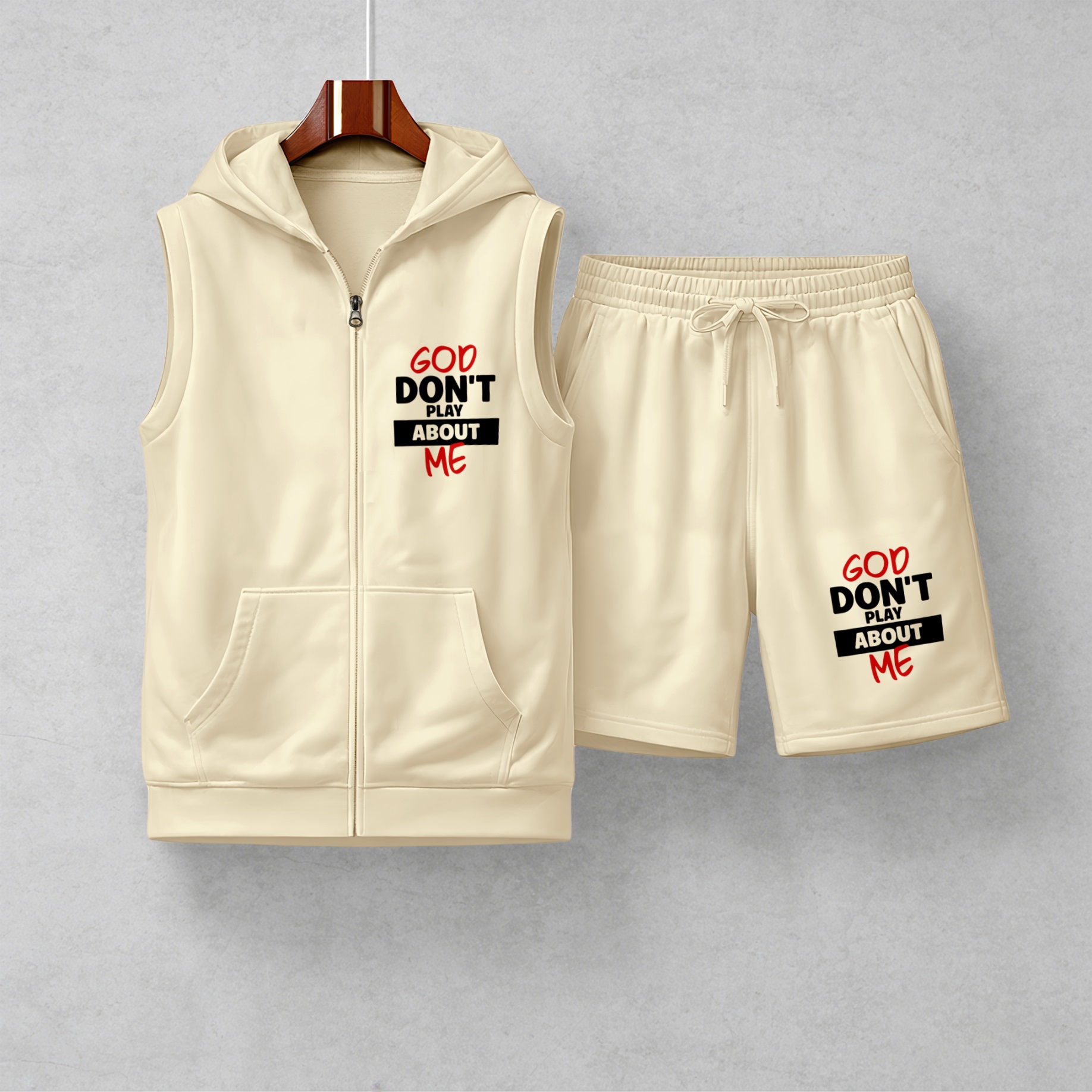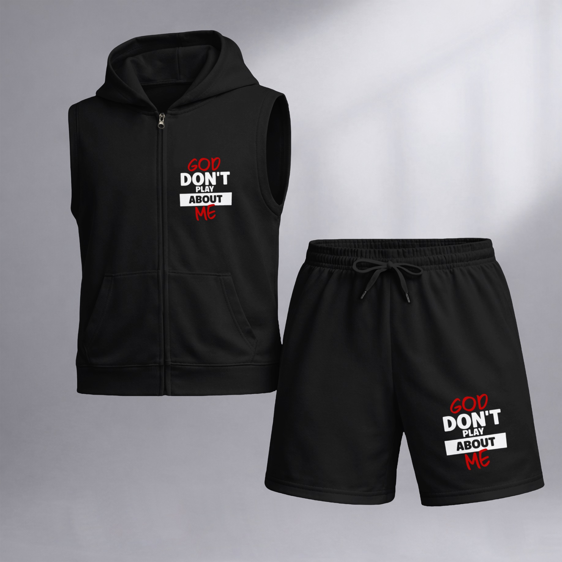 Men's God Don't Play About Me Graphic Sleeveless Hoodie Shorts Set 2 Piece Outfit Faith Letter Print Zip Up Hooded Vest Drawstring Shorts Summer Casual Gym Workout Streetwear Breathable Lightweight Athletic Lounge Set