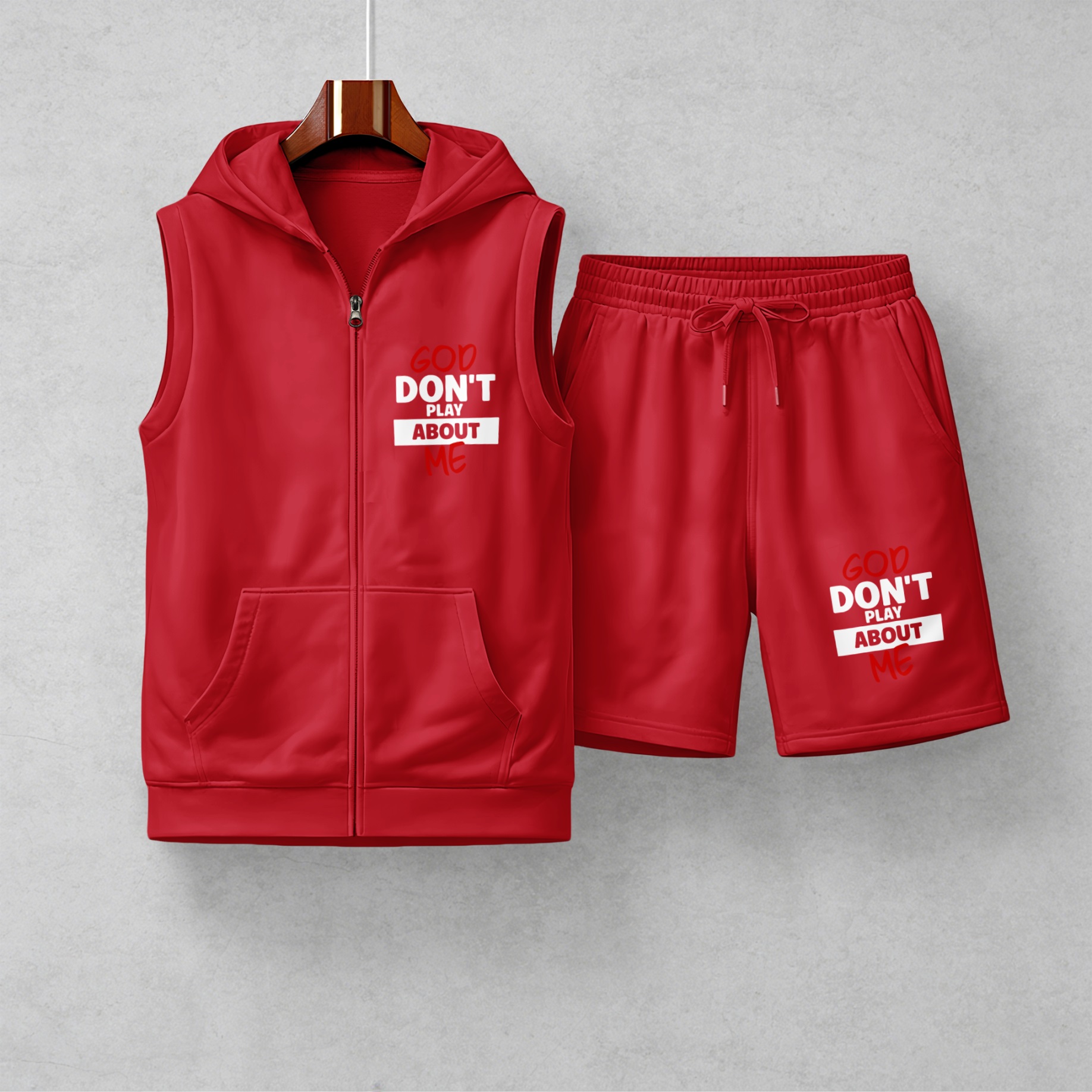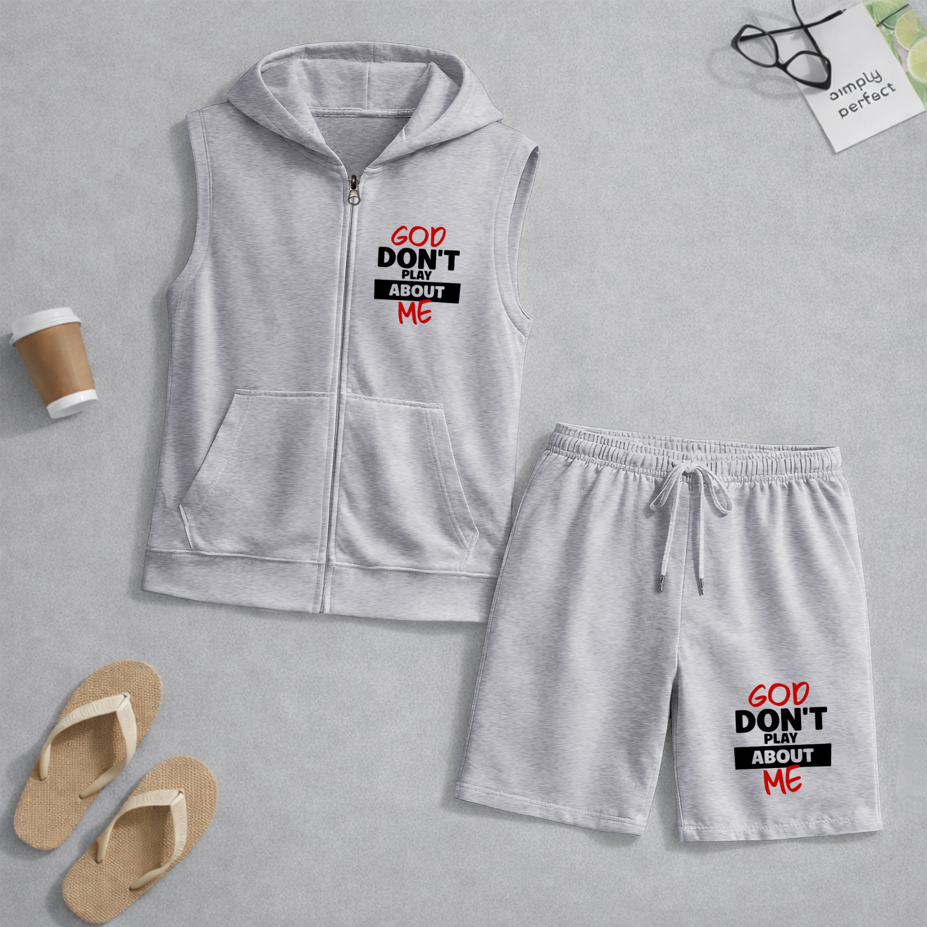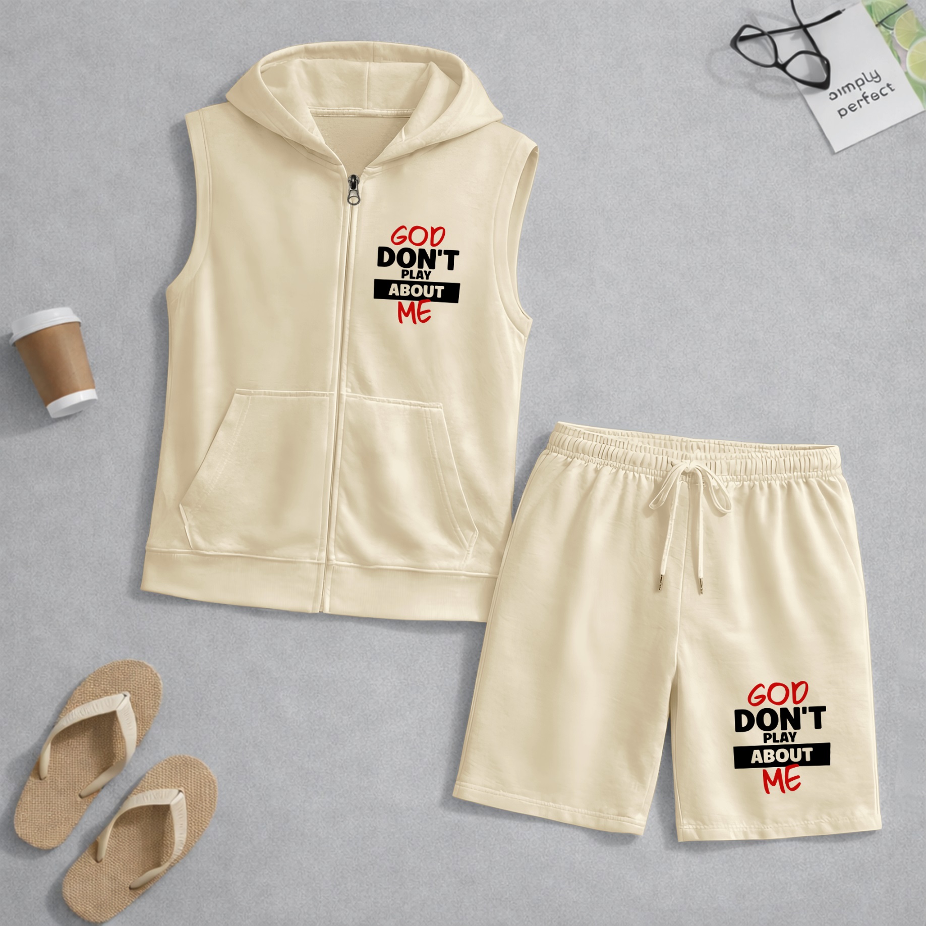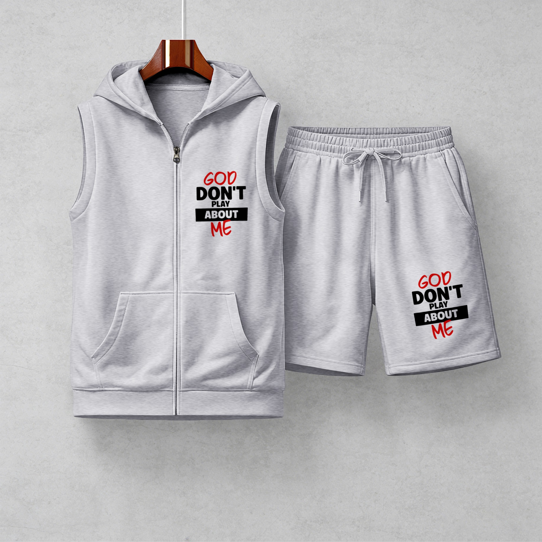 Men's God Don't Play About Me Graphic Sleeveless Hoodie Shorts Set 2 Piece Outfit Faith Letter Print Zip Up Hooded Vest Drawstring Shorts Summer Casual Gym Workout Streetwear Breathable Lightweight Athletic Lounge Set