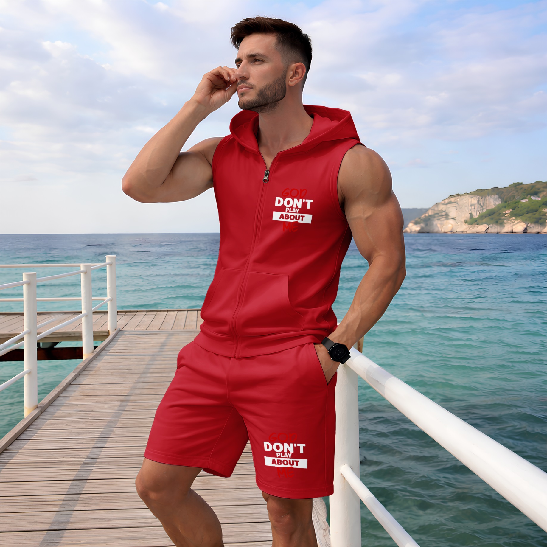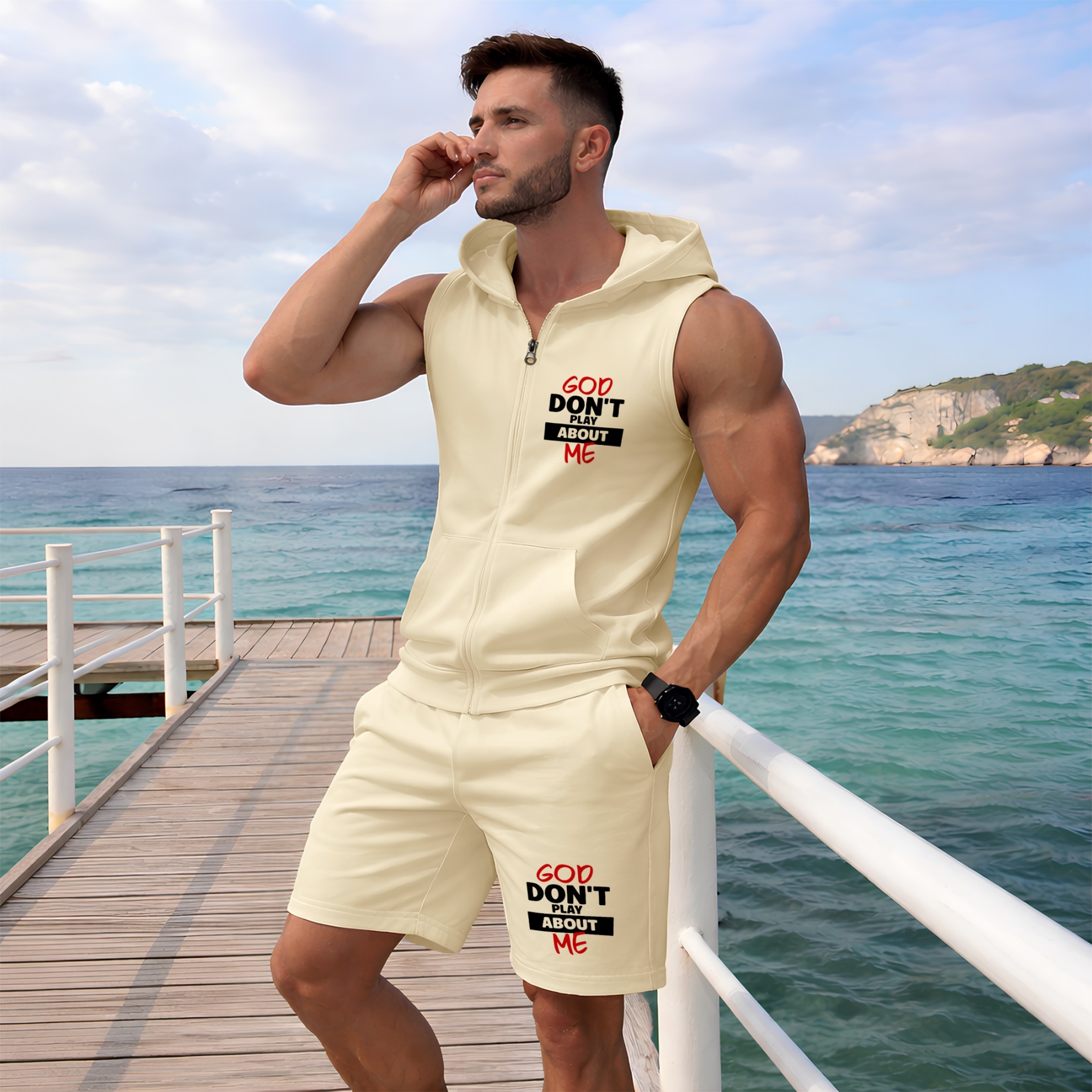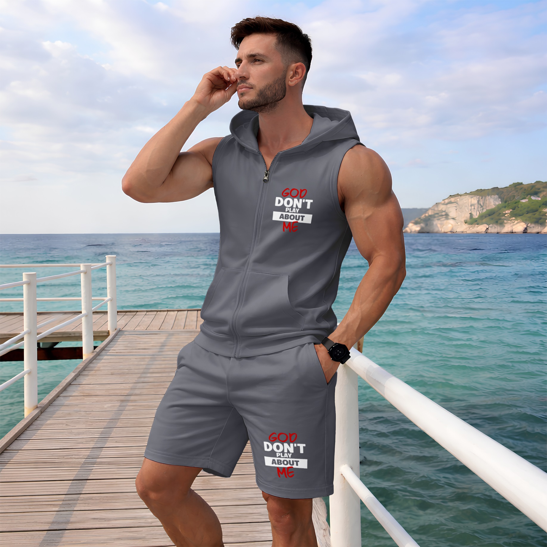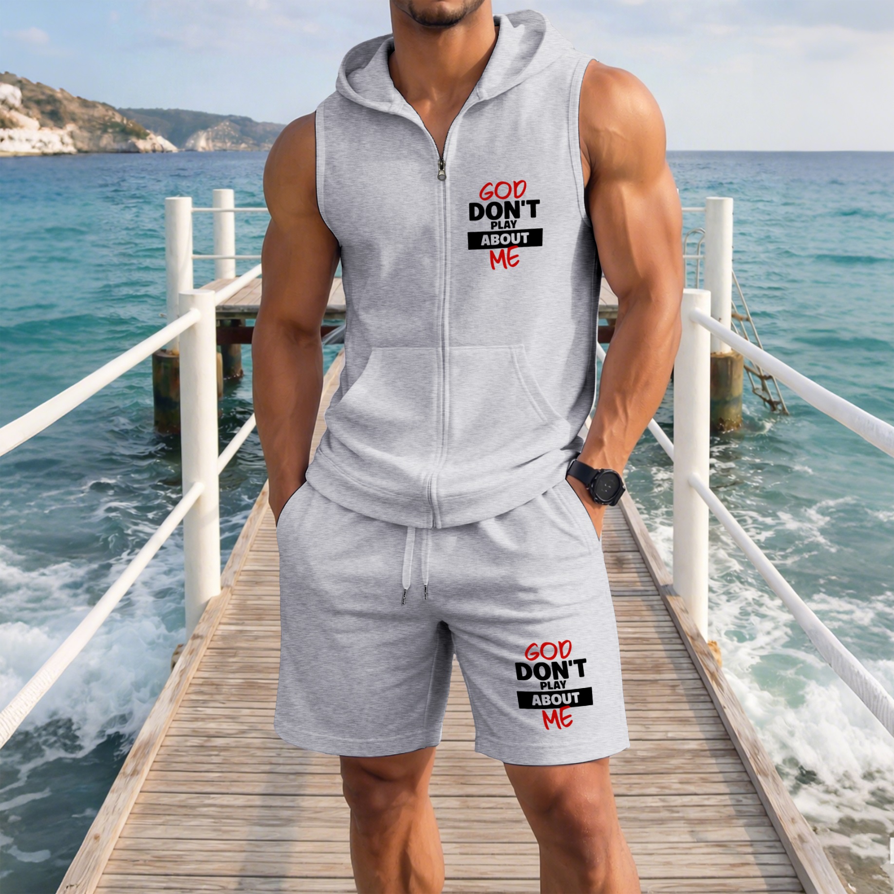 Men's God Don't Play About Me Graphic Sleeveless Hoodie Shorts Set 2 Piece Outfit Faith Letter Print Zip Up Hooded Vest Drawstring Shorts Summer Casual Gym Workout Streetwear Breathable Lightweight Athletic Lounge Set