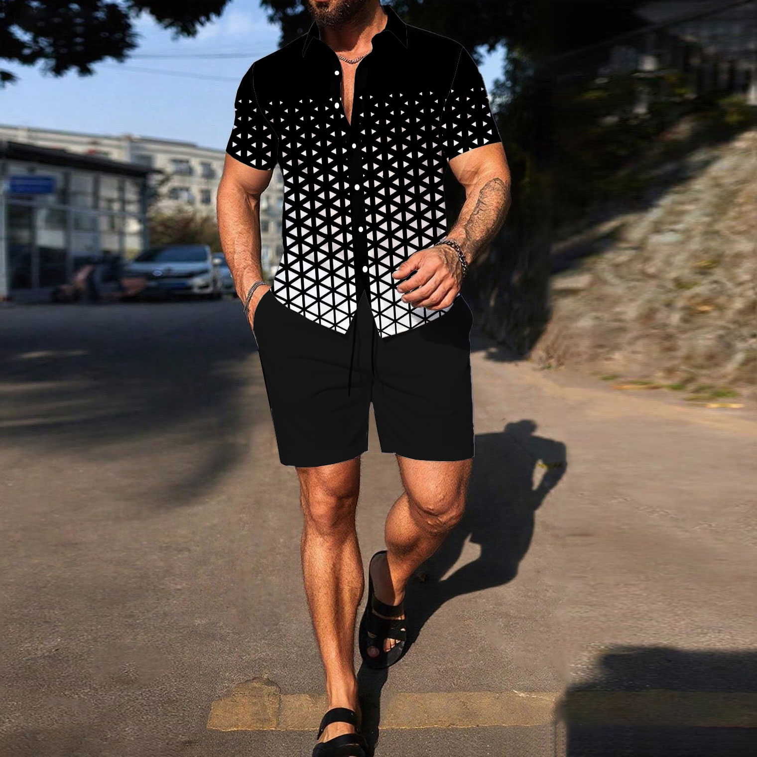 Men's Hawaii Vacation Color Matching Printed Long-Sleeved Shirts & Short Two-Piece Set