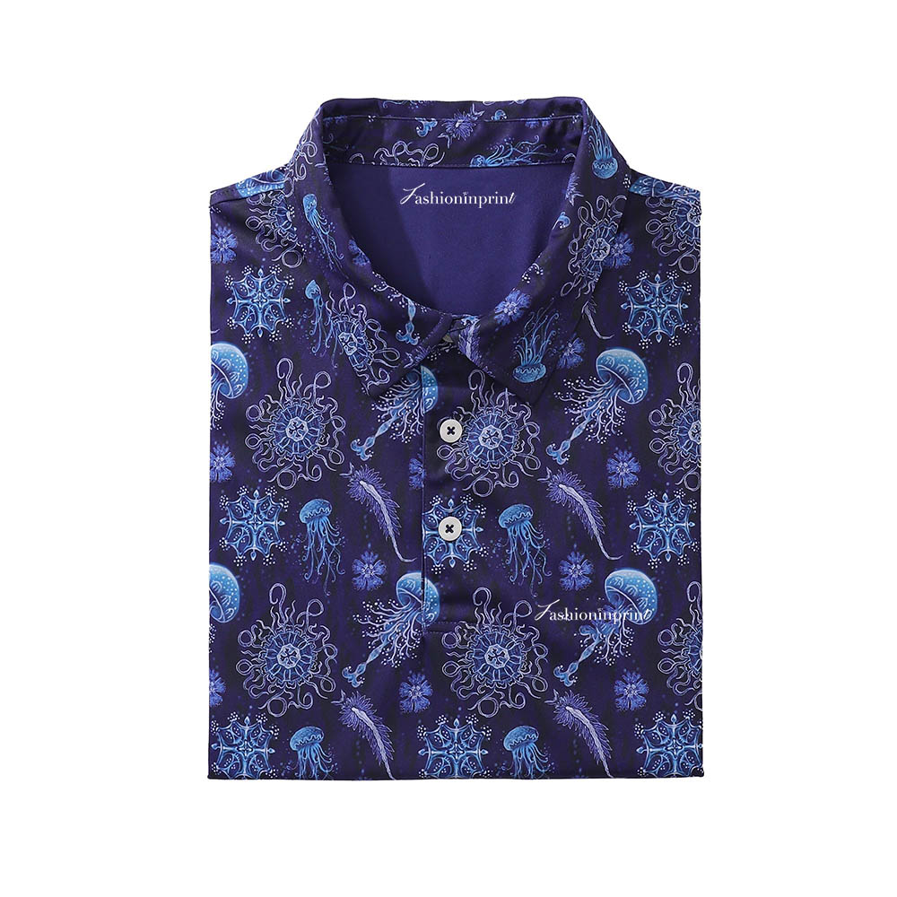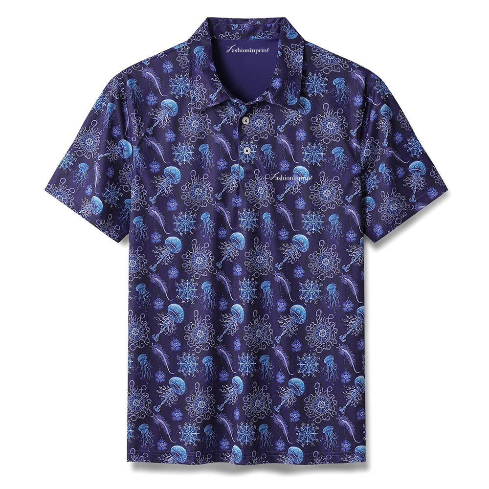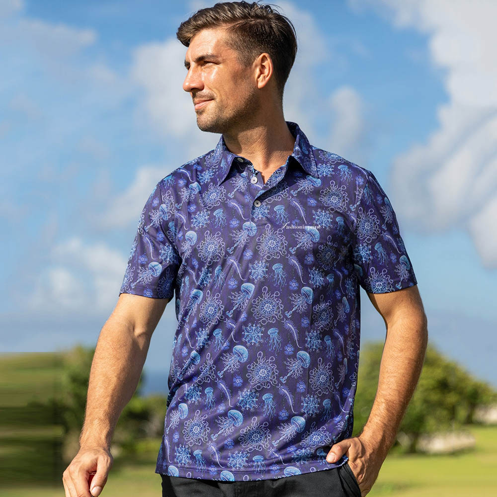 Wear the Men's High Performance Polo Shirt, featuring a whale logo and Luminocean Print By Luova Flow to keep cool and comfortable. The quick-drying, moisture-wicking, breathable polo shirt won't restrict your golf swing or backhand stroke. This high performance polo offers four-way stretch for a close yet comfortable fit. The 3D whale logo polo shirt is a versatile essential whether you're golfing, playing tennis, traveling or casual relaxing. We believe our top moisture-wicking polo will suit your lifestyle - soft, comfy and eco-friendly. A perfect high performance polo for you!