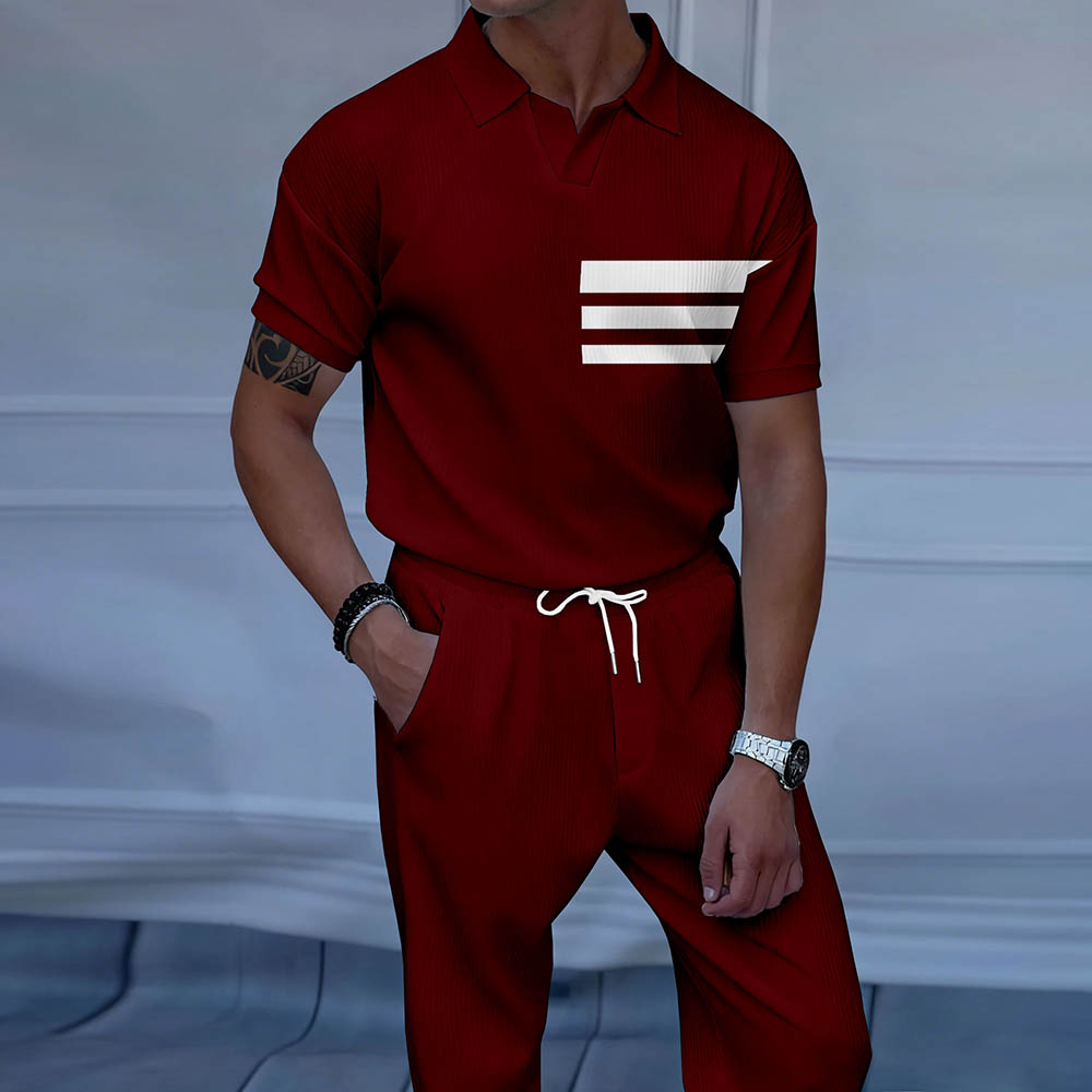 Men's Maroon & White Color Matching Striped Printed Luxury Casual Textured Polo Short Sleeve Suit