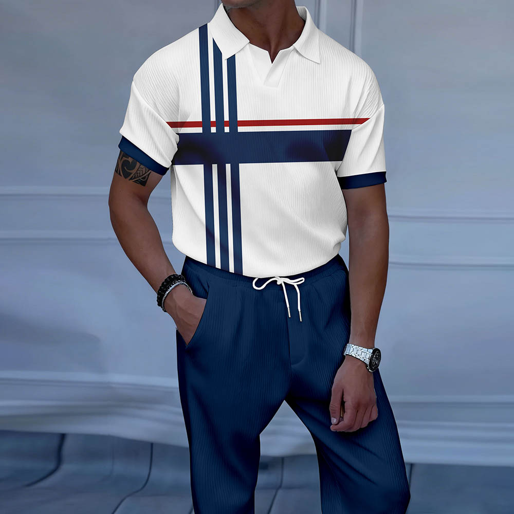 Men's Navy & White Color Matching Striped Printed Luxury Casual Textured Polo Short Sleeve Suit