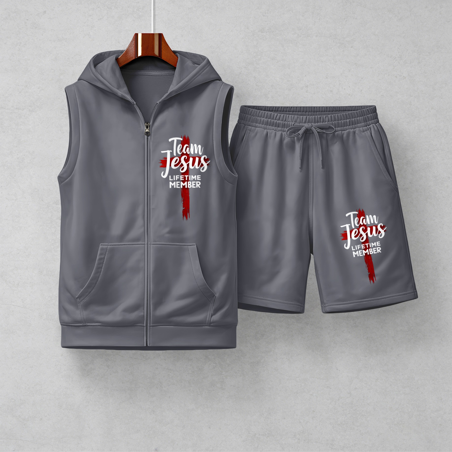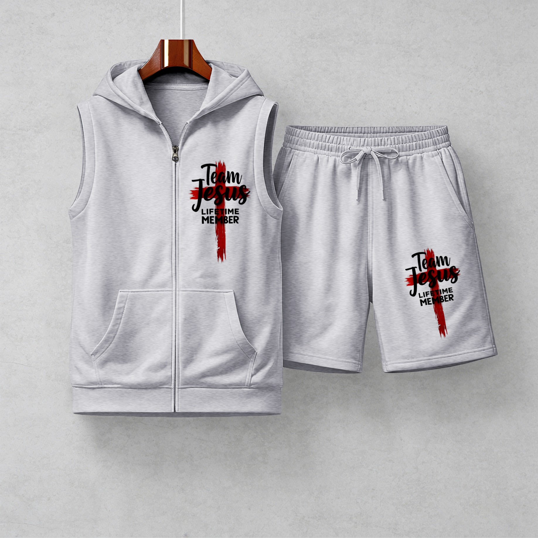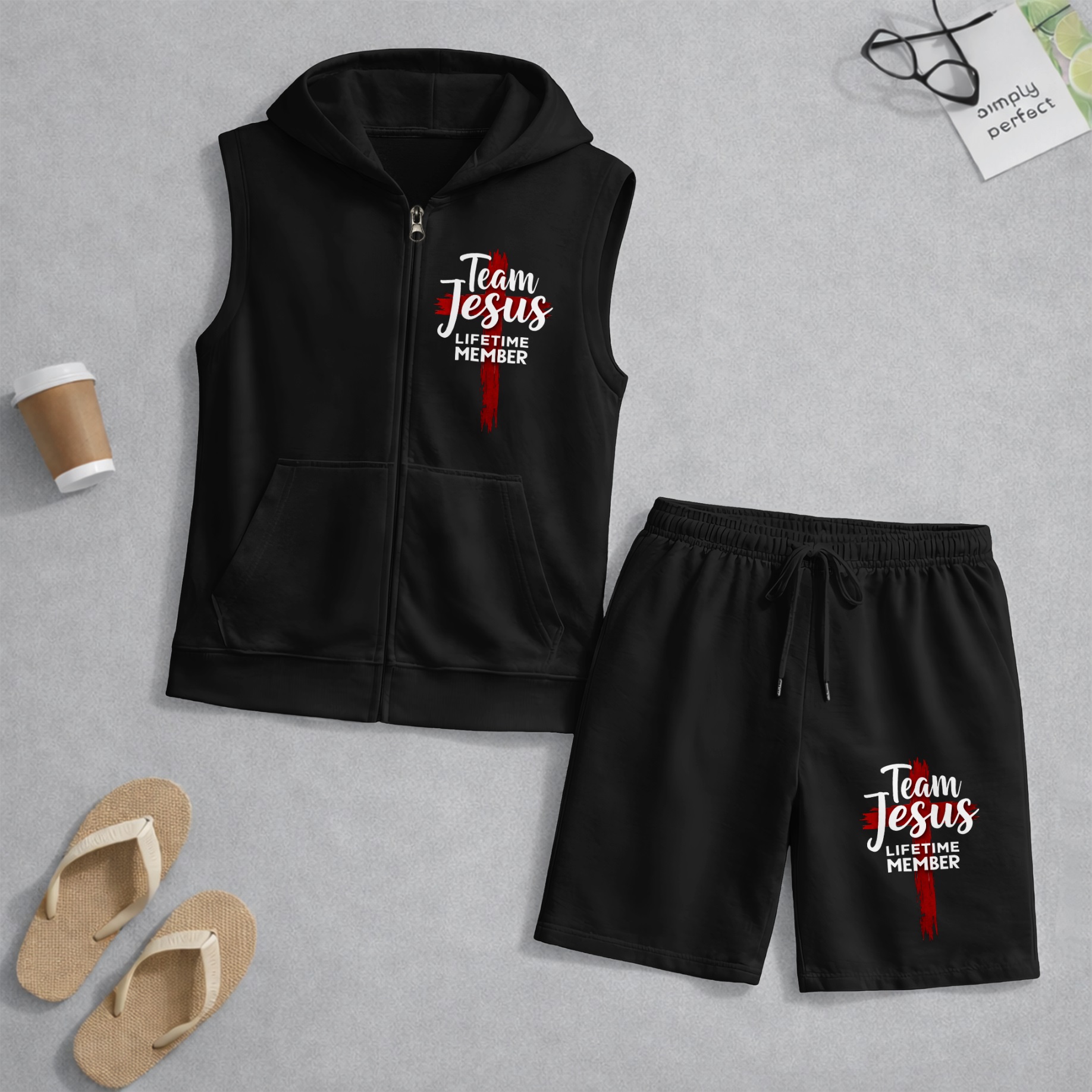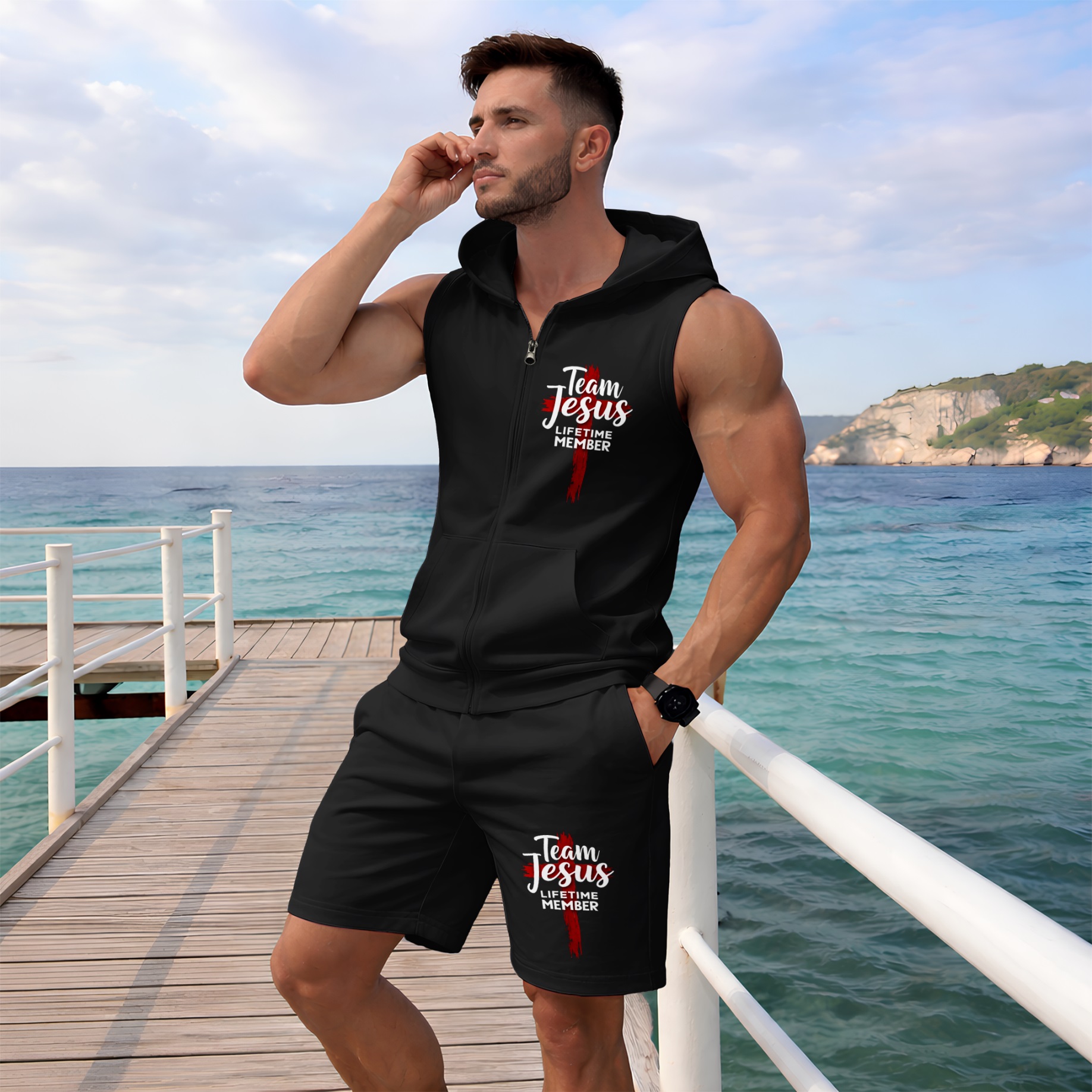 Men's Team Jesus Lifetime Member Graphic Sleeveless Hoodie Shorts Set 2 Piece Outfit Christian Faith Print Zip Up Hooded Vest Drawstring Shorts Summer Casual Gym Workout Streetwear Breathable Lightweight Athletic Lounge Set