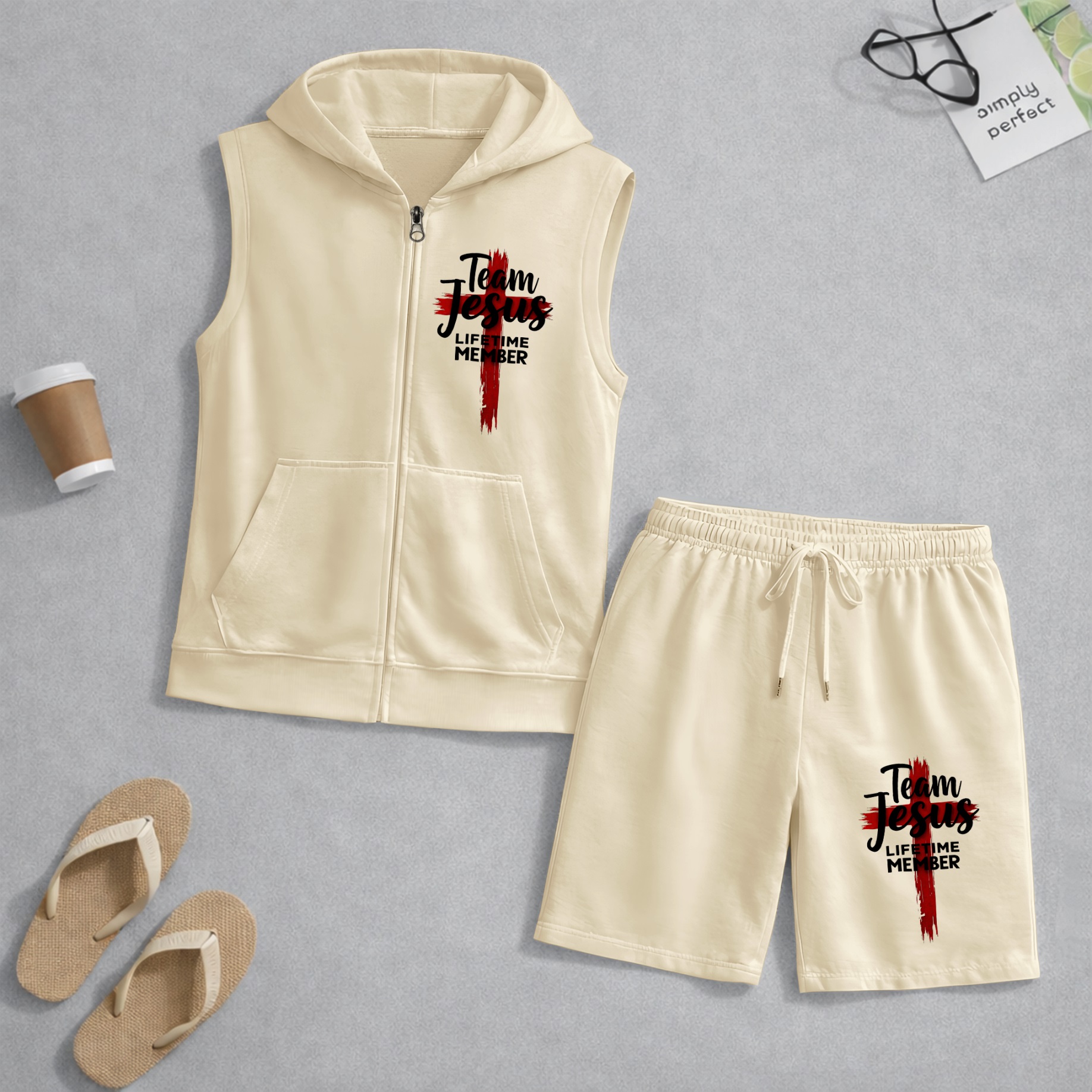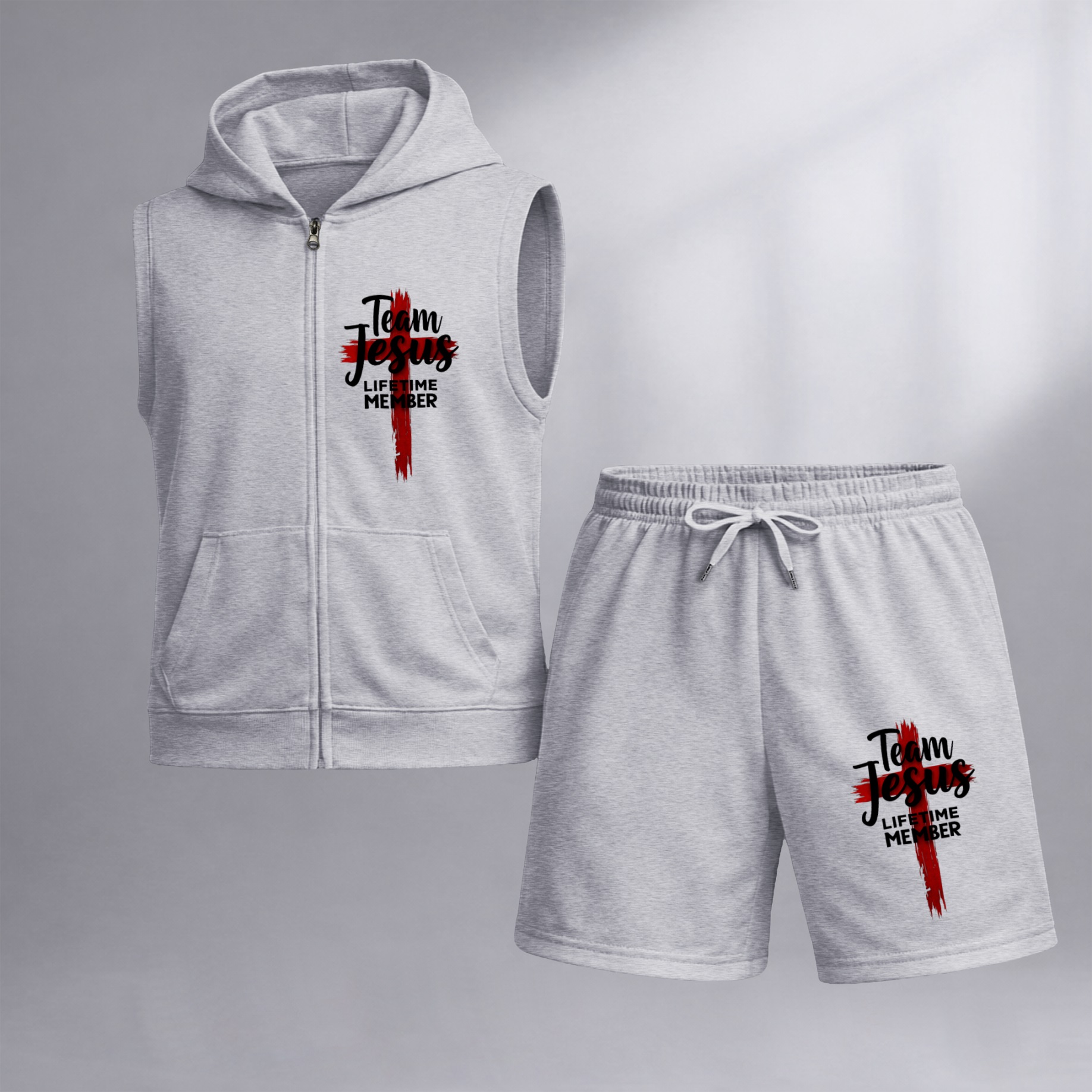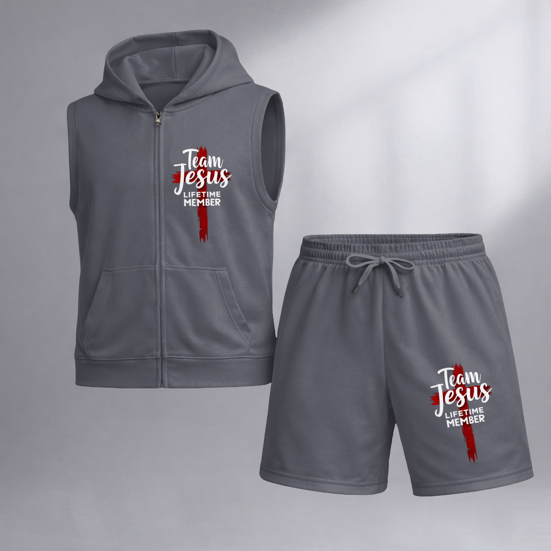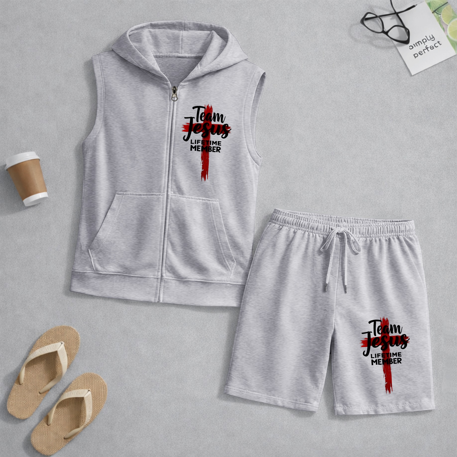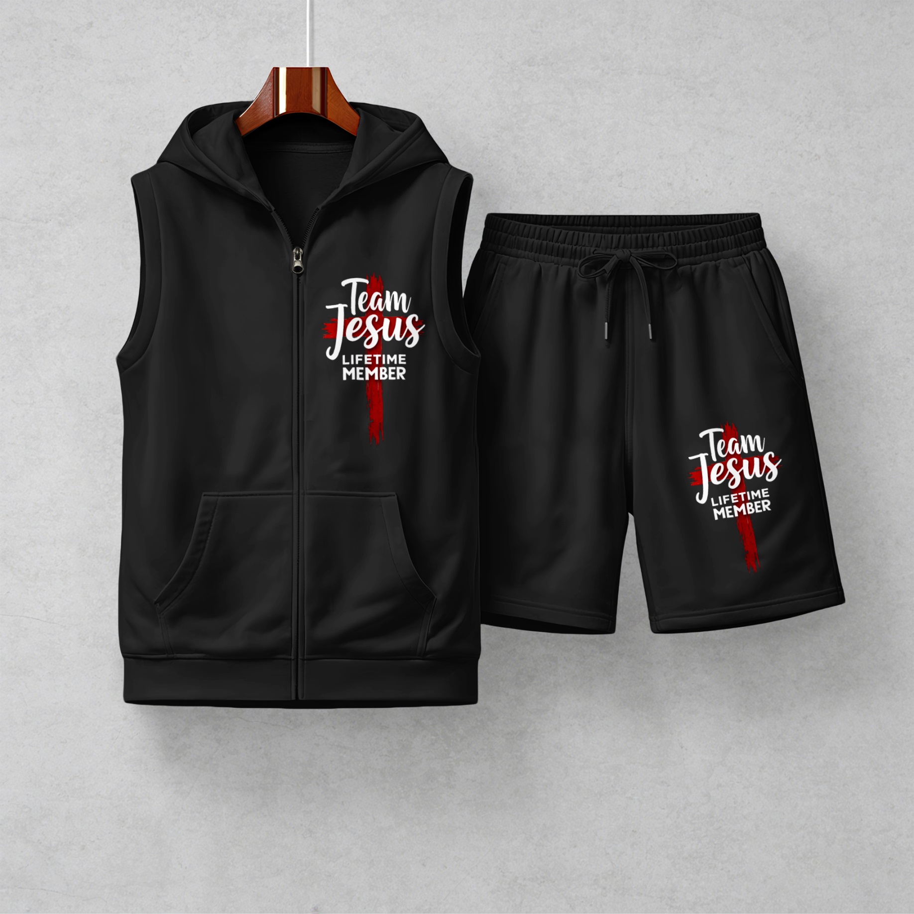 Men's Team Jesus Lifetime Member Graphic Sleeveless Hoodie Shorts Set 2 Piece Outfit Christian Faith Print Zip Up Hooded Vest Drawstring Shorts Summer Casual Gym Workout Streetwear Breathable Lightweight Athletic Lounge Set