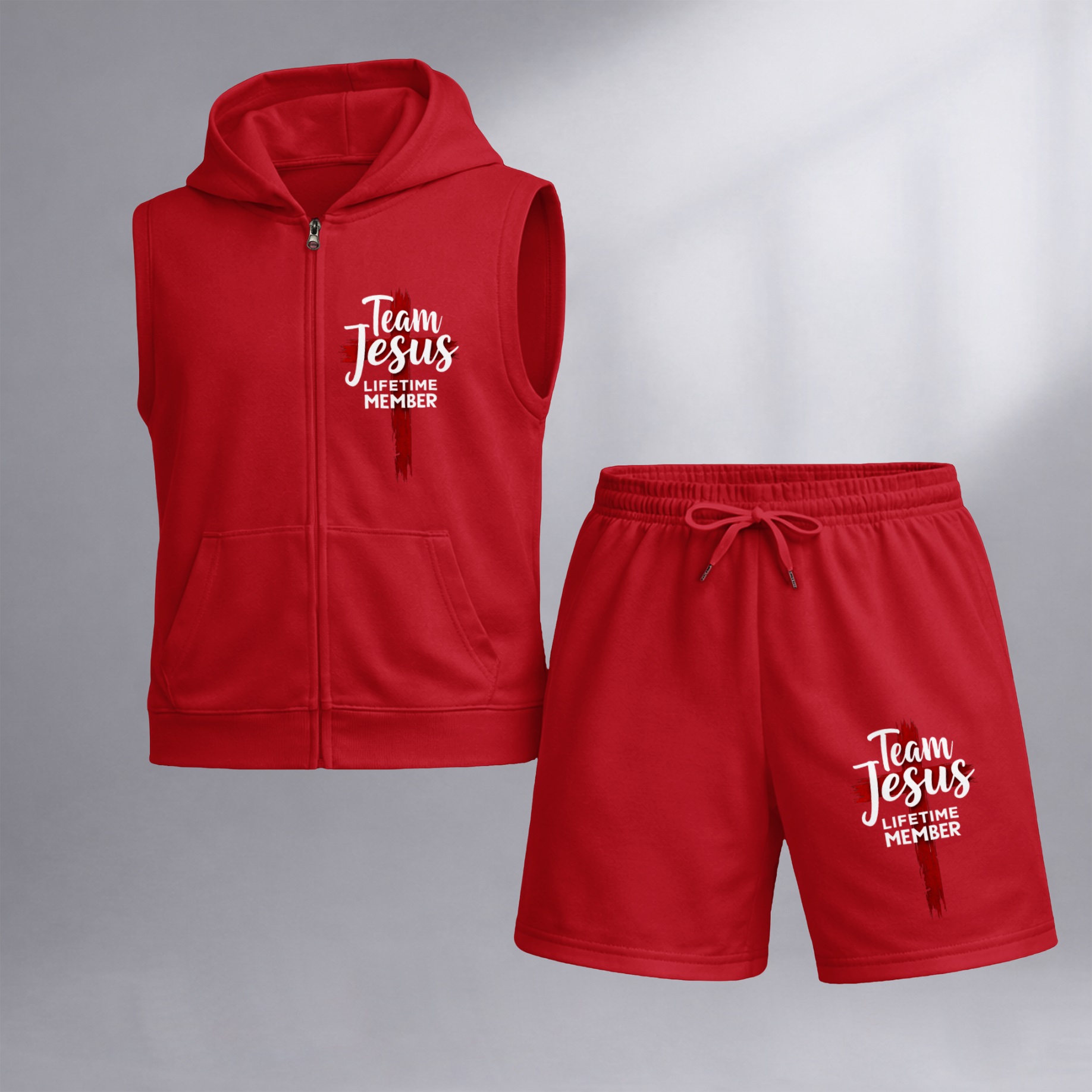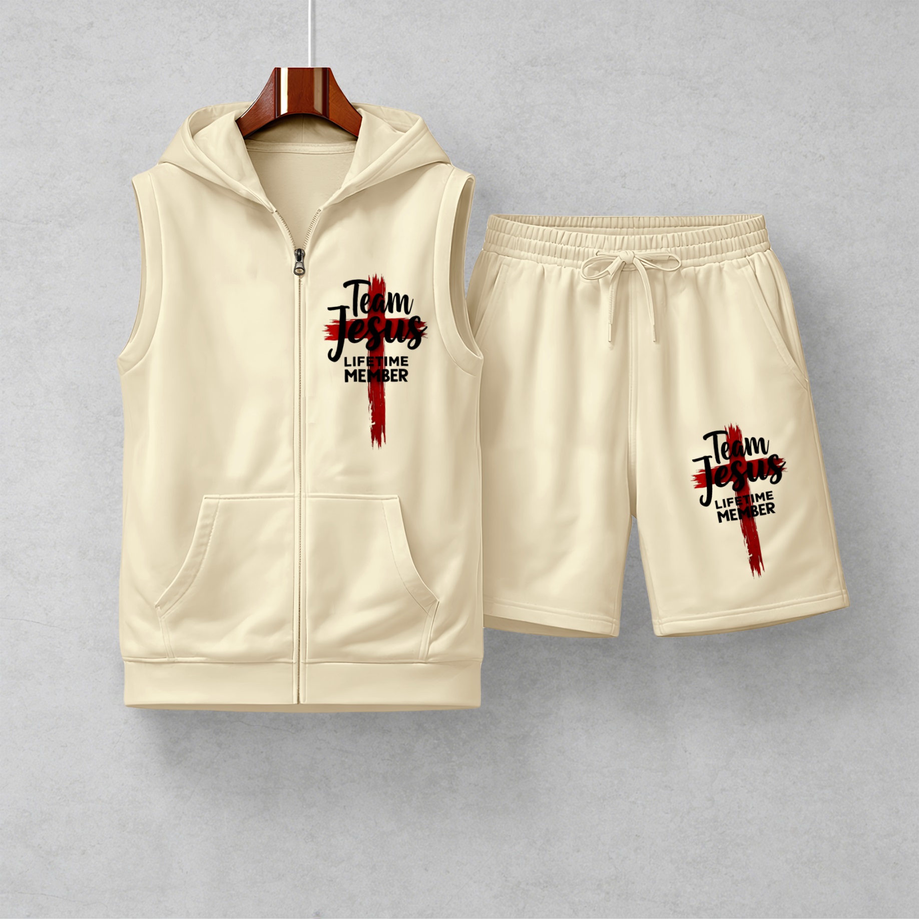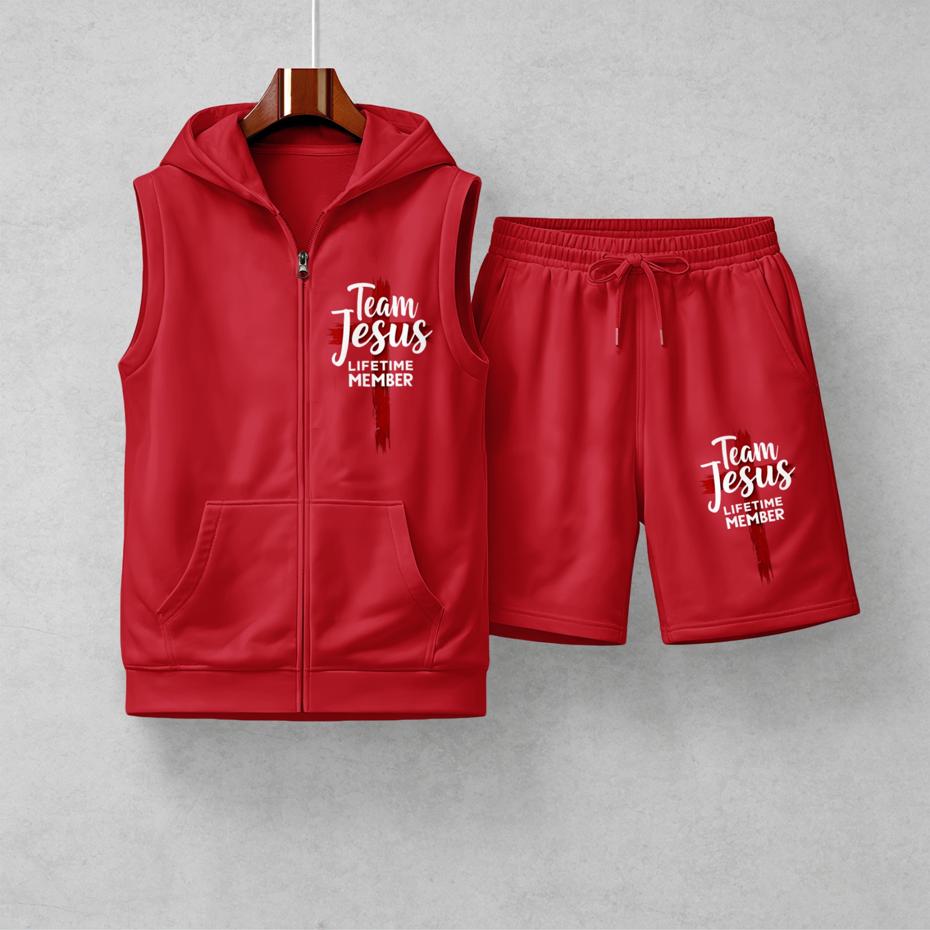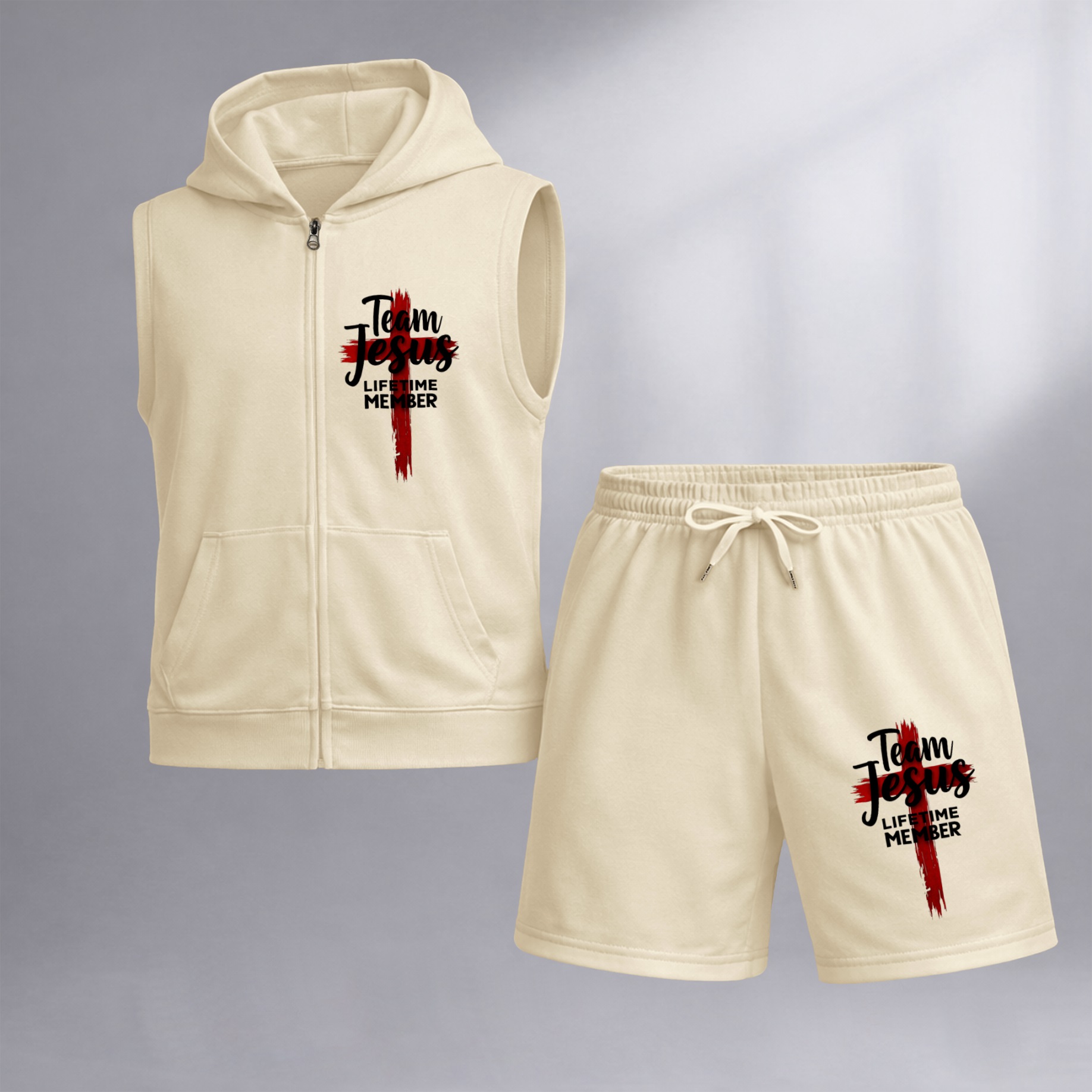 Men's Team Jesus Lifetime Member Graphic Sleeveless Hoodie Shorts Set 2 Piece Outfit Christian Faith Print Zip Up Hooded Vest Drawstring Shorts Summer Casual Gym Workout Streetwear Breathable Lightweight Athletic Lounge Set