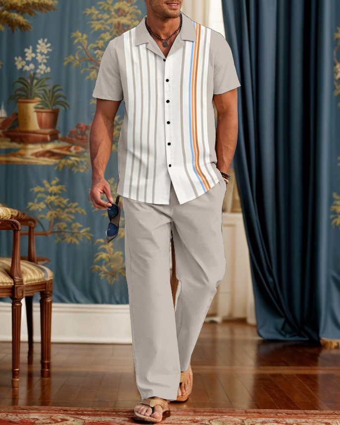 Suitmens Men's Classic Bowling Shirt Contrasting Stripes Walking Suit